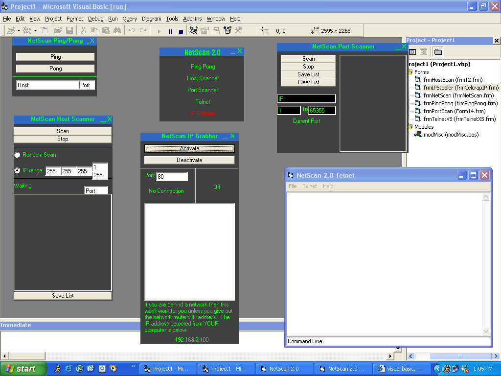 This is NetScan 2.0. It has a totally new look to it, i fixed my form moving code, debugged my apps, enhanced them, and added the Ping/Pong Form. This is a major improvement on my NetScan set of network tools because now, they work. Ping/Pong Gives you a response time, a 10 second time-lease for remote host responses, and error protection. My host scanner is a lot less efficient than i would like it to be. I am working on something to where it would load a timer for each host and try to connect for a certain amount of time. My Port Scanner works, its fast, and extremely efficient. My Telnet Client has improved, is sizeable now, has tutorials, and the option to listen on a port too. It generates HTML Logs now also. The IP Grabber is pretty much the same but it gives a warning about being behind networks, it gives you your IP address, the status, and phase of IP grabbing. Votes would be great and hang around for NetScan 2.0.1, the rebuild, with NetStat. Votes, suggestions, and comments would be great. Please also try to find bugs, I haven't found beta testers.