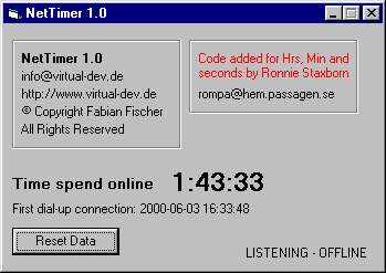 This code is an update of Fabian Fischer's NetTimer. Added some codes to it. It now show you the hours, minutes and seconds instead of only minutes. Added new code for the loggbook.