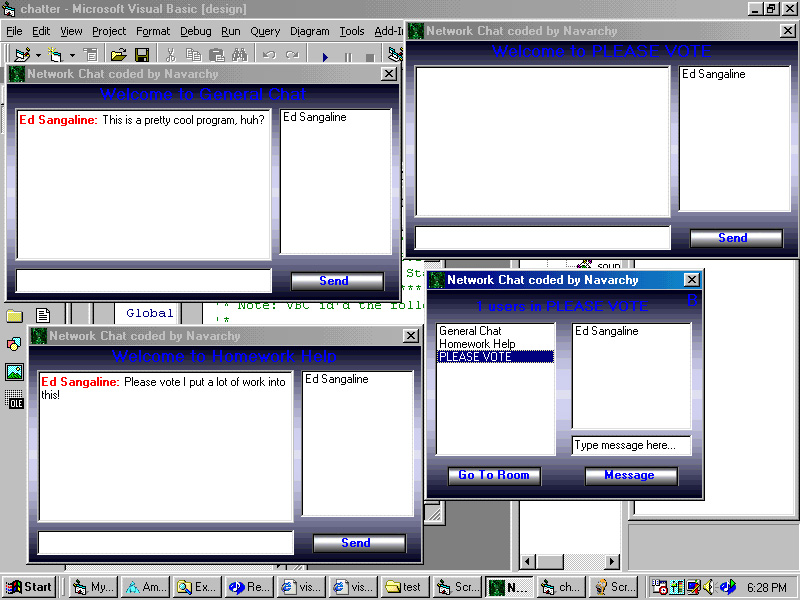 This is a great chat program. It has many features such as background options, private messaging(only on NT(, ten chat windows, the coolest shutdown sequence ever, and some really cool sound effects! Also avaliable are many administrator options. In the main chat window press alt + a and type the password "scow". This code is made for networks, but works great without one. To setup the program either place the .exe in a place that can be accessed from any computer or set the variable thefullpath equal to a place that everbody can access(more info on this in code). I put a lot of work into this so *PLEASE VOTE*