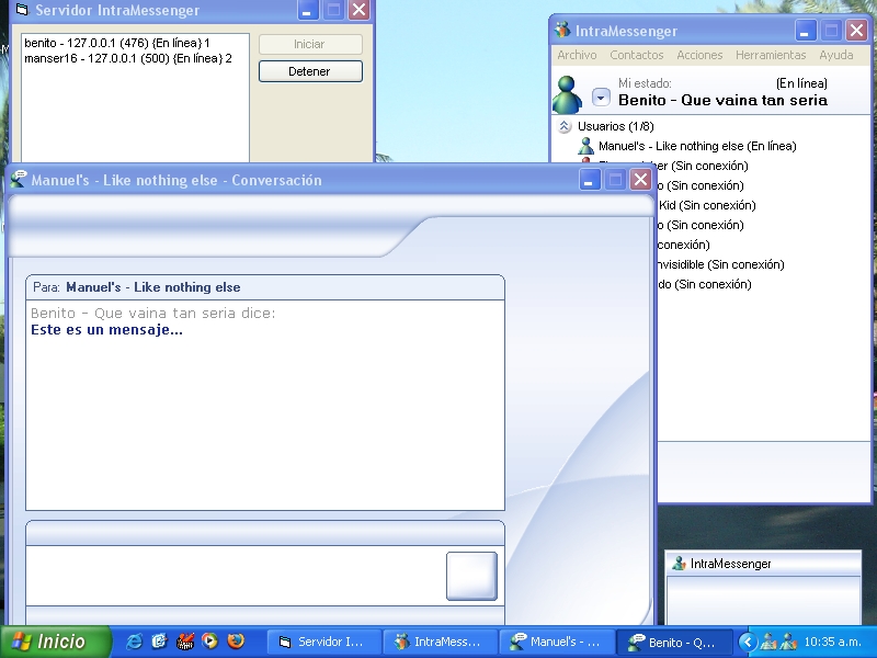 English: This proyect allow you to estabilish communication between computers of a same network, this app works like the MSN Messenger client. This app have two basic components, the server (where all settings are stored and the service is administered), and the client (who connects to the server.) Some bugs fixed on this release, new features add. PLEASE VOTE!!! :) a multilanguage version comming soon!!!