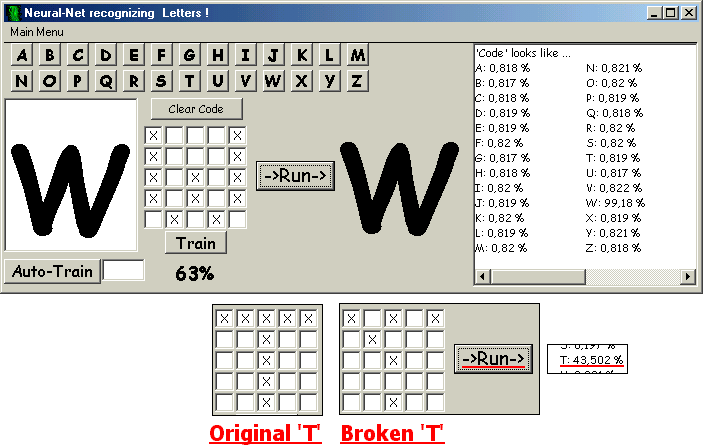 After teaching the NN the Letters, you can make (f.e.) a 'Picture' (= Letter-Code) that looks NOT EXACLTY the same as an "F" an the Neural Net will tell you that your NOT-EXACLTY-the-same-"F" looks mostly like an "F" ! =)
