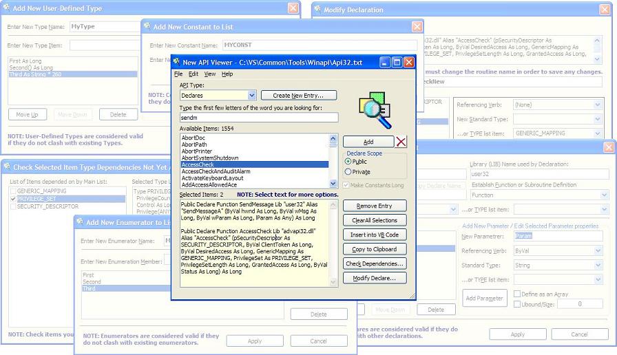 Updated to feature a binary-embedded Manifest and allowed constant lookups to be interactive. This Add-In is a working replacement for the API Viewer that comes with VB6. The New API Viewer comes as a stand-alone executable and as an Add-In to the Visual Basic 6 IDE. Additional features in the New API Viewer that are not in the standard API Viewer: * It gives you the ability to declare dynamically constants as Long in the selected local copy of a constant. This allows the user to keep program speed optimal by not slowing down for variant conversions. Although constants can be of types other than Long, the VB6 API interface uses only Long Integer values for its constants. * It gives you the ability to create new constants right within the viewer. Assigned values are expected to be numeric, as is required by the VB6 API interface, but the values can be declared as hexadecimal, octal, or binary. You can also apply + or - offsets. Constants are created as all-capitals. No complex checks are performed on the value. It simply assumes that you know what you are doing, because such checks can involve complex offsets and naming of other constants. The viewer will also check to ensure that the newly entered constant does not already exist. * It gives you the ability to create new API Declarations right within the viewer and add them to your API list. * It gives you the ability to create new User-Defined Types right within the viewer and add them to your API list. * It gives you the ability to create new Enumerations right within the viewer and add them to your API list. * You can Delete entries from the API list. * It gives you the ability to edit Declared Subroutine and Function parameter lists, and apply these changes to new subroutine or function names (for example, saving a modified version of SendMessage to SendMessageByNum, after changing the lParam as Any to ByVal lParam As Long). The built-in Declaration Editor makes such changes a breeze with just a few clicks of the mouse. * It automatic checks for new parameter dependencies. If an added declaration or user-defined type requires another user-defined type not included in the selection list, you can view the requested types in a dialog and select them or reject them for inclusion in your selection list. This can make resolving declaration headaches such as with the complicated AccessCheck Function, which requires the additional inclusion of the GENERIC_MAPPING, PRIVILAGE_SET, and SECURITY_DESCRIPTOR types. These additional types in turn require the ACL and LUID_AND_ATTRIBUTES types. These newer types in turn also require the LUID type. The New API Viewer makes farming these additional types a breeze with a few quick clicks of the mouse. * Additions created within the New API Viewer can be optionally saved for later re-used in the API data file. New entries are appended to the API file with a date- and time-stamp marker. * It immediate displays updates when you toggle between Private and Public declaration options, define parameters as arrays or fixed-length strings, change a return type, or change the referencing verb (ByRef/ByVal or None). * It includes a copy of and richly expanded freeware API32.TXT by Dan Appleman (president of Desaware, Inc.), which he had derived from the original Win32API.TXT file. On top of that, I have also included several thousand new Constants, Declarations, and Type declarations.