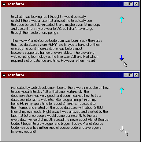 It's not another "scroll text in a label" code. He can scroll WHOLE label with text within. Ready-to-use and easy-to-understand user control project. Check the screenshot and see how it works. Just put ScrollingLabel into your form, add dozens of text, set scrolling interval and enjoy :) It has nice arrows (scrolling (up or down): starded, could be continued, not possible), plus fully customized properties: BackColor, BorderStyle, Font, ForeColor, ScrollingInterval. If you like this user control please vote. Thanks :)
