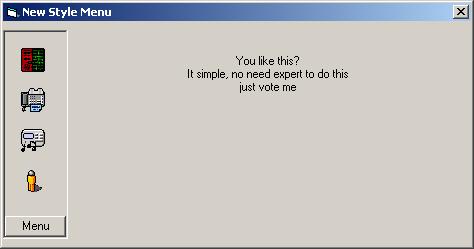 A group menu like Ms Access, it can scroll when you click the button. When you over the button it will enlarging the size with sound. No need an api, it was simple and good for basic of a beginer. Vote me if you like it.