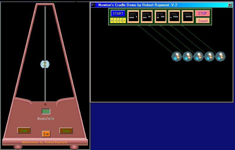 Newton's Cradle & Metronome by Robert Rayment. (UPDATE using QueryPer... API) Simulates the known movement of balls in an idealized Cradle with variable speed & improved timing for the Metronome. Two progs. Win98 & WinXP Zip file 24 KB.