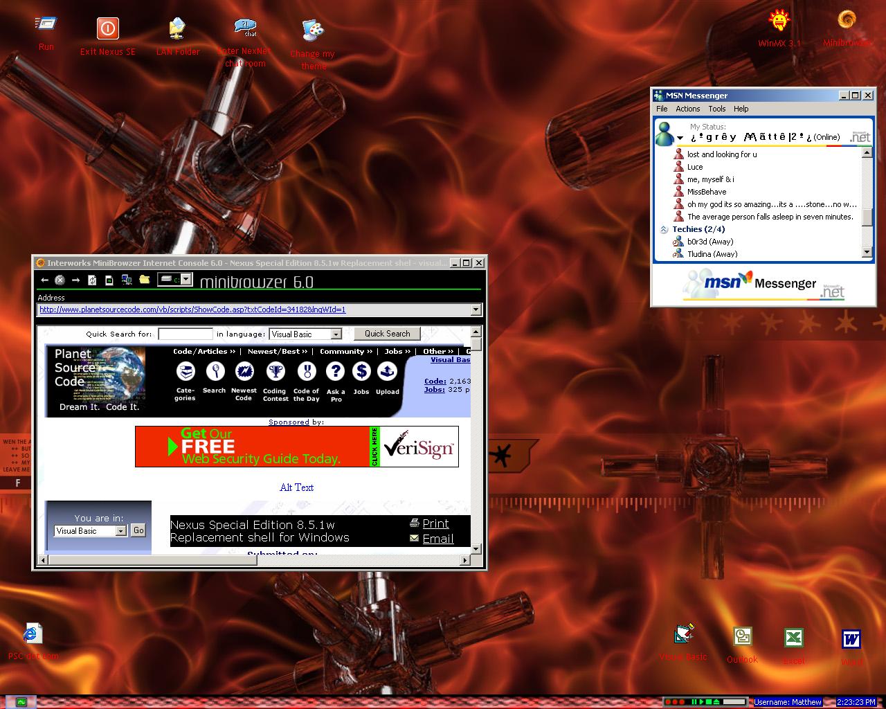 Nexus Special Edition is a replacement \ companion shell for MS Windows. It has many features, over 4MB worth of pure source code and commented generously.. Multiple user enabled, User rights policy system, Icon Transition FX, Skinnable theme components, RSA Encryption, Lock desktop icons with password, lock computer, built in Snake game, Shortcut menus, etc etc... The .zip file contains System files, Compiled installation (required for media and folder structure) and the source code. If you have any trouble getting the code to work, e-mail me and I'll try to help you as best as I can :). May even put a FAQ section up on my website. More screenshots available at http:\\www.angelfire.com\d20\vbfiles\files\nexus\nexus_scr\index.html. Find out about my new shell im developing at http:\\www.angelfire.com\d20\vbfiles\vb.html. Please feel free to e-mail me any suggestions about Nexus\EZShell [in development]. Enjoy! PS: You will need WinRAR from winrar.com to extract the source code element. (WinRAR is higher compression) 6MB download includes all required components. Background taken from www.skinz.org. Module PROBas.bas by unknown author [refers to non-working fusionz.net]. I have a new shell in the works at the moment that will supersede Nexus [view website 4 details]. Mail me if you have any questions. Hope you like the code guys!