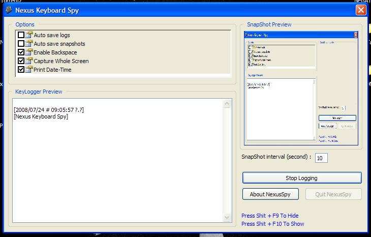 This one's just a simple key logger. also you can take snapshots with it. ive seen some codes for taking a snapshot from the screen by using Virtual Key API. and thats kinda not right, 'cause when you're monitoring and logging pressed keys, also those virtual pressed keys will be logged, so ive used another way in this program.