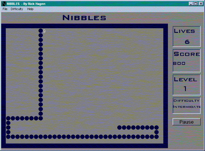 This is my old nibbles game revised I add a few new things like save game and load game and difficulty levels and made the apperence alot better looking .