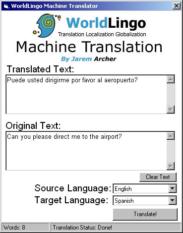 Thats right, it translates English, French, German, Spanish, Japanese, Korean, Portuguese, Chinese, and Italian from the WorldLingo Database!It works perfect execpt needs a bit of ascii corrections.