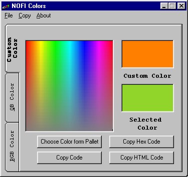 NOFI Colors is an easiest-to-use small utility that helps you to save the color of your choice. You can Copy the RGB function or QBColor function or the Hexadecimal code of any color to the Clipboard which can be used while coding your application in Microsoft Visual Basic. You can also Copy the HTML code of any color to the Clipboard which can be used while designing your Web Page. Your comments will help me to improve.
