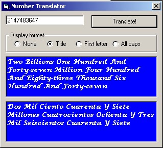 That's right, all positive long values up to 2147483647. This simple algorithm can translate any positive long value to its string equivalent, both English and Spanish. The principle is simple: Process three digits at a time because the cycle is repetitive every three digits. The only thing you have to append every time is the order qualifier: Thousand, Million, or Billion. The code of the main function is commented, and the other functions are just plain very easy, so no commenting there. The user interface shown here is very simple because the object of this post is the functionality! :) BONUS: Included (and made just for fun) there is a custom uppercase function. It was programmed under the principle that switching between lower and upper case, all you have to do is flip bit &H20. It also writes to the source string directly by mapping an array to the string buffer (advanced stuff). I did not benchmark, but supposedly, this upper case method should be a lot faster than regular string manipulation, although I don't know if it is faster than the VB upper case function. If you want to implement this in one of your applications, all you have to do is drop the module in. Please vote and comment.