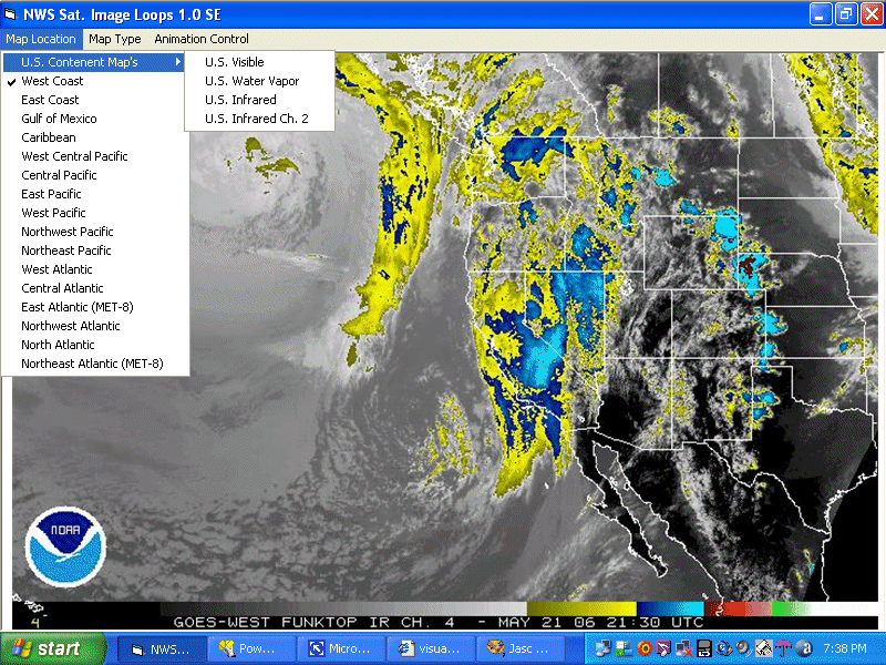 Well thanks to the parsing routine I worked out the other day we have satellite loops again. A special thanks also goes out to the NWS Satellite Services Division, for the new well organized server file system. Without their updates this program wouldn't have been possible. Images automatically update on 2 Min. after the quarter of every hour provided your system clock is accurate. If your running XP this shouldn't be an issue. You may need to run down the GDI resize DLL. For it is required for this program to run. If their are any unforeseen issues that I might have overlooked please feel free to post it. I sincerely hope everyone enjoys this new code & puts it to good use. Please let me know of any improvements you might make, I would love to see them. Update 1: I added the U.S. Continent map's & a map advance speed selector. As well as making the change that xim suggested. Update 2: I added 'Freeze on latest image'.