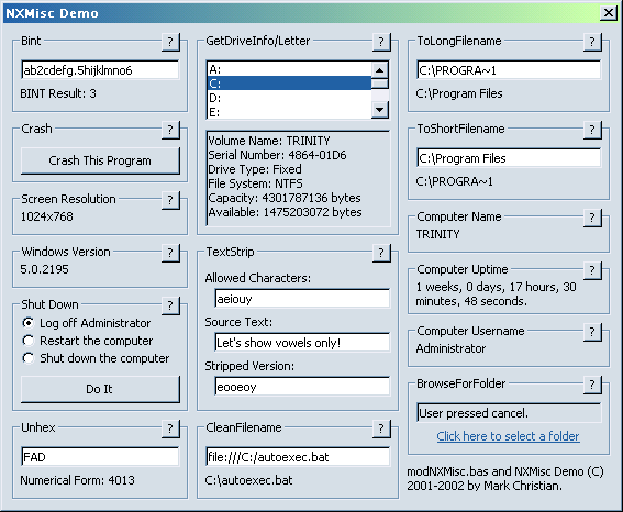 NXMisc is a collection several useful functions that new and old programmers alike should find useful. Includes functions for cleaning up text, converting long filenames to short and back again, getting the computer name, getting the Windows version, name of the currently logged in user, getting uptime, and more. This includes an application that demonstrates the usage of all of them.