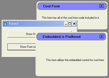 Makes a "Trekkie" looking form by simply dropping the control on the form. Very light-weight, not a ton of features, but a very nice effect. There are two versions, one is a form that has all the code written into it, the other is a form utilizing the cool form control as an example of how much cleaner a project is when things like this are compartmentalized.