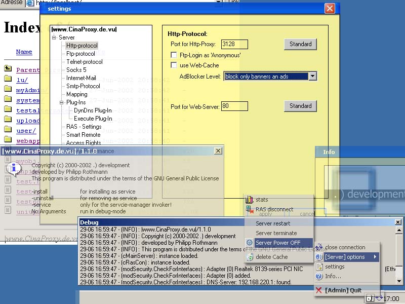 the cina proxy is a multifunctional proxy project completly written in vb6. project life time more than 2 years. good combination of techniques and algorithms shown in serveral other projects that have same aims. the project is just a tutorial how to design a smart proxy for your lan. it is not a solution, but it can solve serveral problems that might not sell your firewall. This project is just in alpha release phase, but if you are interested in proxy programming send your feedback and vote.Please vote and give feedback if this is the tool youa re looking for. it is not NAT or a firewall, but can be used beside ones.