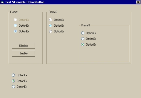 This is a Skinnable OptionButton. Works like the original OptionButton provided by MS. Fixed problem when setting all optionbuttons value to true in desing time. Now only one can have value set to true in design time.