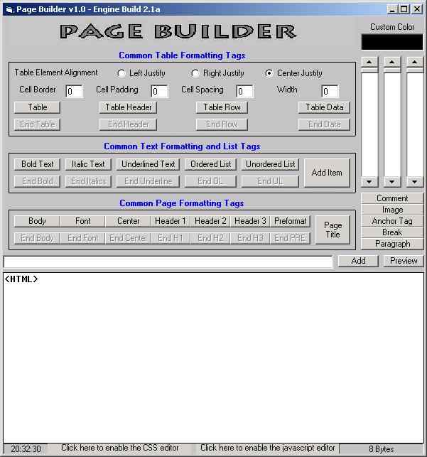 PageBuilder is a program that allows the user to make web pages by pointing and clicking (with minimal editing). PageBuilder currently supports the most commonly used HTML tags, CSS commands, JavaScript commands (editing is still required for the javascript to work properly), and XML, along with an XML previewer.