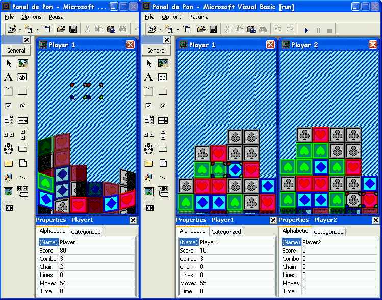 A remake of Panel de Pon/Tetris Attack/Pokemon Puzzle. Now with online play, chains now register correctly, and basic/pathetic AI. But you can turn the AI's speed to compensate for it's current lack of ability. Fixed garbage block behaviour, added the 3D/Cylinder mode from the N64/Cube versions