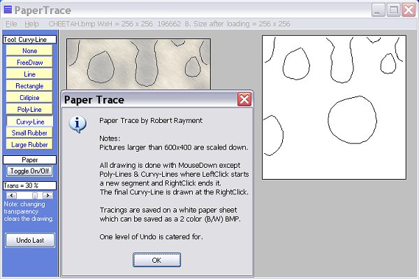 Paper Trace by Robert Rayment. This consists of an image sheet (Loaded image), a translucent tracing sheet(Faded image to draw on) and a white paper sheet (The actual tracing that can be saved as a 2 color(B/W) BMP). The screenshot explains more. To show the method I've kept it simple in that large pictures are scaled down, avoiding scrollng code. Zip 36 KB.