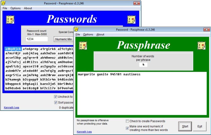 Create passwords (up to 5000 at a time) and pass phrases (one to twenty-five words). Be sure to read Form_problems.pdf if you encounter any display quirks. Well documented.