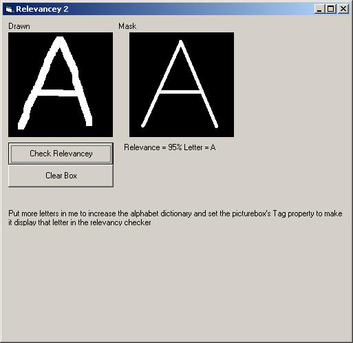 This is a new standard in patern recognition ( Relevancy algorythim ) This program gives you a small 150,150 sized drawing aeria where you can write letters then the program will search ur drawing space and convert it to text (this can be edited and modified to do your homework lol not that i promote that)