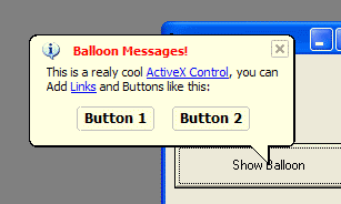 I have personally tested the ActiveX Control PBBalloon 1.2 from PABLOB.NET and I am really impressed!, using it, I was able to create Balloon Messages like the ones in Windows XP under Windows 95, and with features I’ve never seen, like Links and Buttons in the Balloons and the possibility to change the Balloon Text, Font and Colors while the Balloon is visible, That allows you to create cool Effects like the ones found in an example included in their download.