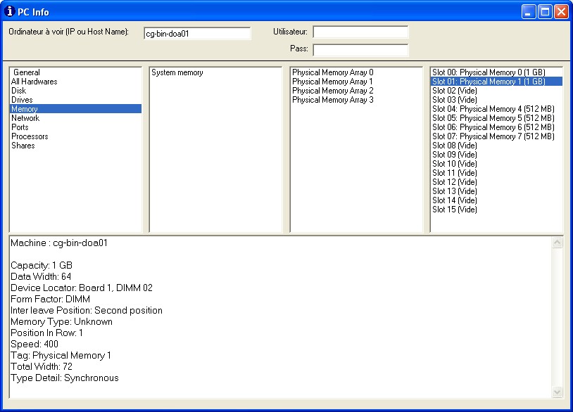 PC Info, to get the hardware informations (HDD, Processors... and specially Memory modules) using WMI.(OS Systems: NT4 with WMI, 2K, XP)