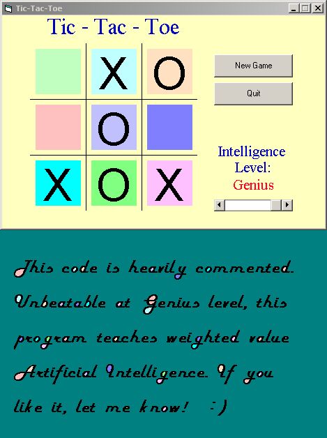 Demonstrates the use of variable levels of AI to challenge an opponent at any level. Highest level is unbeatable, lowest level is very easy. This code is HEAVILY documented (see for yourself). Can you beat the "Clever" level???