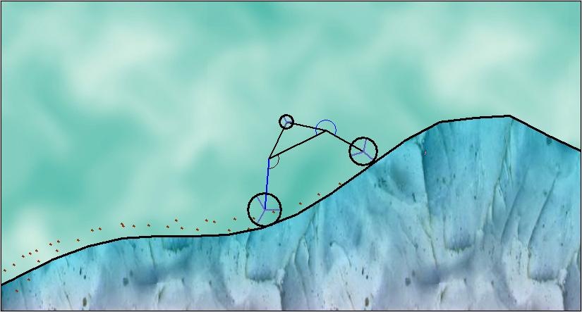 ***** Main creature is called "bot" and is implemented by the class clsbot. It consists of: POINTS that can be pure, wheeled or motorized wheels; LINKS that work like springs and they bind the points together; MUSCLES between the links that are defined as an angle that the links should take and a strength. This Class should be used for more general pourpose, but in this case it manages the vehicle and the ground. *** New features: * Collision of not wheeled points. * Impoved doMuscles Sub. * Dynamic Links, Dynamic Muscles.