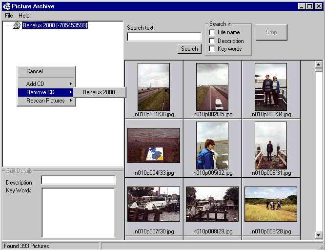 The Picure Archive read and store information of pictures on CD. Show and store thumbnails, enable picture searching by description or keywords.