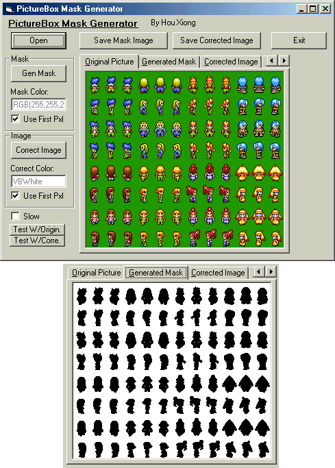 I'm not sure if this has been done before, but here it is. This program will automatically generate a mask which you can use with blt'ing transparent images using GDI32 or some others. You can also implement this code into your very own games and never have to make external masks! This is a fully operational program so you could use it to generate and save masks for your games or aplications.
