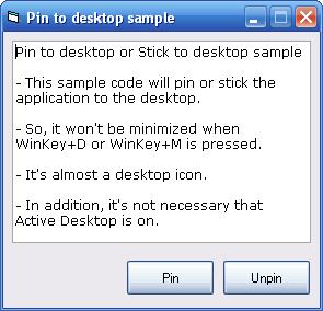 Module to easily pin (or stick) and unpin an application to and from Windows' desktop. It will work with "Active Desktop" on or off and with "Show desktop icons" on or off too. The WinKey+D or WinKey+M won't minimize the pinned application. Tested only in Windows XP. Last update: added unpin sub.