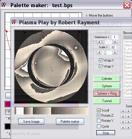 Plasma Play by Robert Rayment. Just playing with plasmas & palettes, if you like that kind of thing. Only tested on WinXP, should be OK elsewhere. If you have trouble with the manifest file then rename or delete it. Zip 60KB.