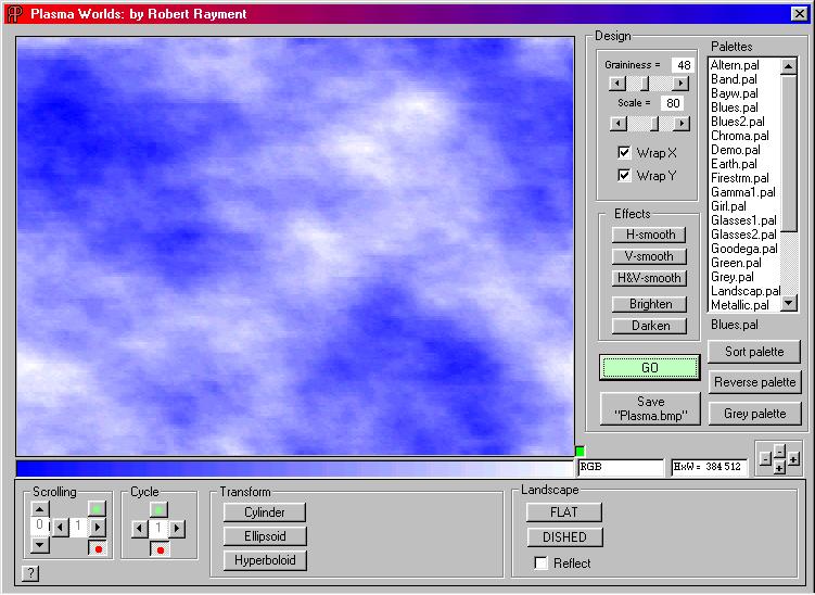 Plasma Worlds by Robert Rayment. (Cylindrical tunnel added to ASM version)Two progs. One, pure VB (no APIs or OCXs) for making plasma screens that can be saved as a bmp, bit slow but adequate when compiled. Plasma uses a non-recursive routine on to any rectangle and can be wrapped for tiling. Graininess, scale & color palettes can be changed. The other prog is the same PLUS scrolling in 16 directions, color cycling, cylindrical, spherical & hyperbolic wrapping and fantasy landscape projections all with multiple controls - VB+APIs+ASM, much faster. Only tested on Win98, should be OK on ME & XP but some Win2K OSs have problems with this use of Assembler. Please let me know your OS if you find bugs. Zip 79KB.