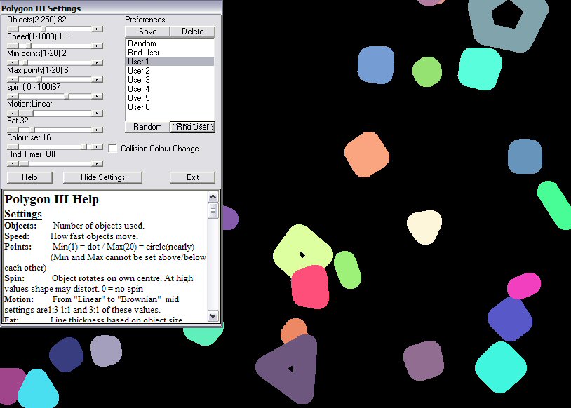 Converted to allow more variety of shapes. Collision detection and all basic ideas are thanks to Brian Adriance. I rebuilt some of his routines to allow faster or more various values to be used easily. Sub DrawPoly is mine designed to allow a random number of points to be drawn. The polygons change shape in an orderly way cycling for min to max points then reversing direction. While you can use it as a screen saver (with random setting of number, speed, points and fatness) you can also experiment with the appearance by Left-clicking on the screen to show a form which allows you to play with the settings or by Right-clicking you can randomize the settings again. To stop the screensaver hold down a mouse button and drag it or press any key. NOTE Small bug causes initial bad redraws when timer fires but the clear up on next collision.