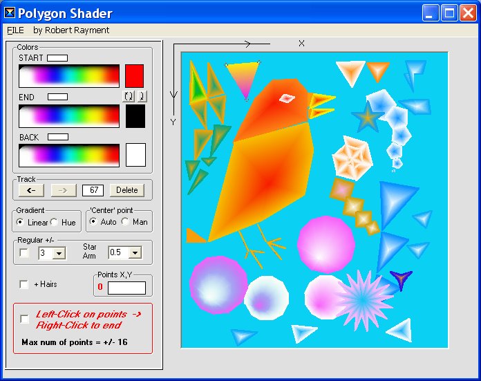 PolyShader by Robert Rayment. (+ Stars) Demonstrates shading of regular and user defined polygons. Zip 36 KB.