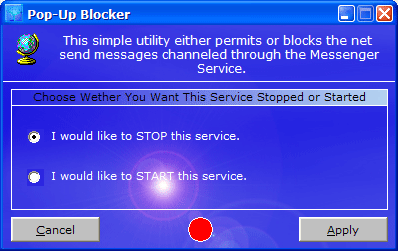 This utility either stops or permits the Messenger service. This service, if permitted, allows users to send annoying 'Net Send' messages to your computer. I have seen tons of requests for a program like this; and even websites that are selling an application with the exact same functionality as this one for over $50...crazy. Anyway, if these messages are annoying you, this is the program for you. Hope it helps you out. Comments, threats, jokes are always appreciated! :) By the way, this was tested on a Windows XP machine; nothing else. If it doesn't work for any other operating system, please let me know.