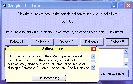 This code will show Windows 2000/XP-style popup balloons. They were introduced in Windows 2000, and in XP they're seen all over, especially in the system tray. But Microsoft hasn't released how to use them yet (except for tray icons),and--if they did--it would only work on Windows 2000 or later. This project shows you how you can use these balloons in your programs. Instead of relying on Windows to make them, this program makes its own. Therefore, it will not only work with Windows 2000 and XP, but also with all other versions of Windows (down to 95). ..... Original submission can be found here: https://www.vbcoders.com/vb/scripts/ShowCode.asp?txtCodeId=31434&lngWId=1