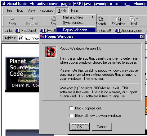 This simple application appears as a menu item under the tool menu in Internet Explorer and permits users to enable and disable popup advertising.