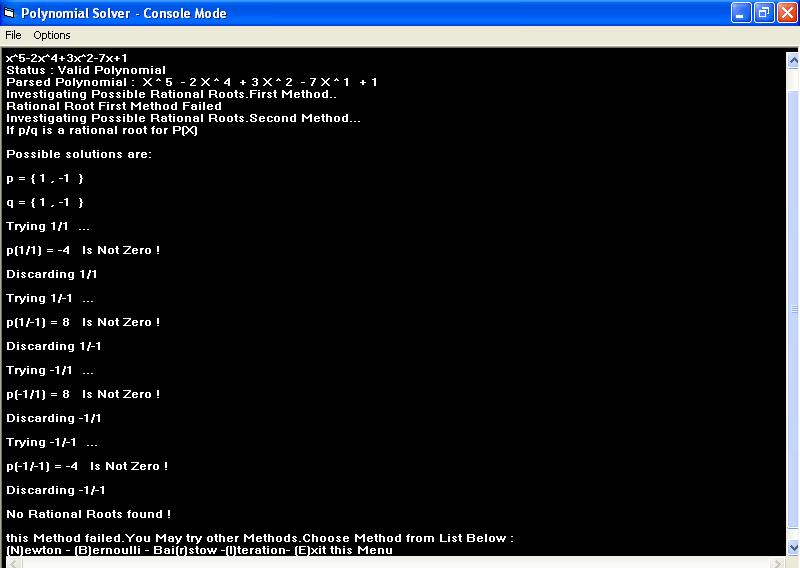A console based polynomial solver capable to factorize polynomials of High degrees.It includes a validator and parser to detect coefficients and degrees.It uses different strategies for solving depending on the Nature of polynomial.