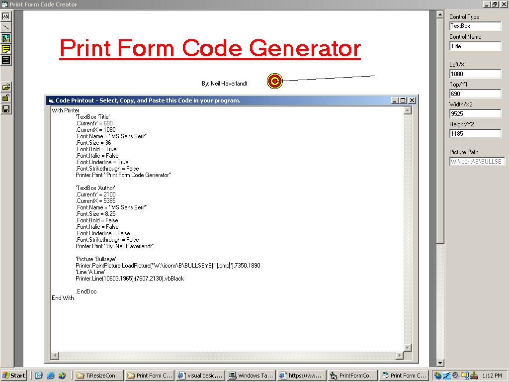 If you hate writing VB code to create printed forms, give this a try. Print Form Code Generator lets you create forms by dropping text boxes, pictures and line on a form and generate the VB print code to paste in your program. This is the first version and it can only get better. Feedback is welcome.