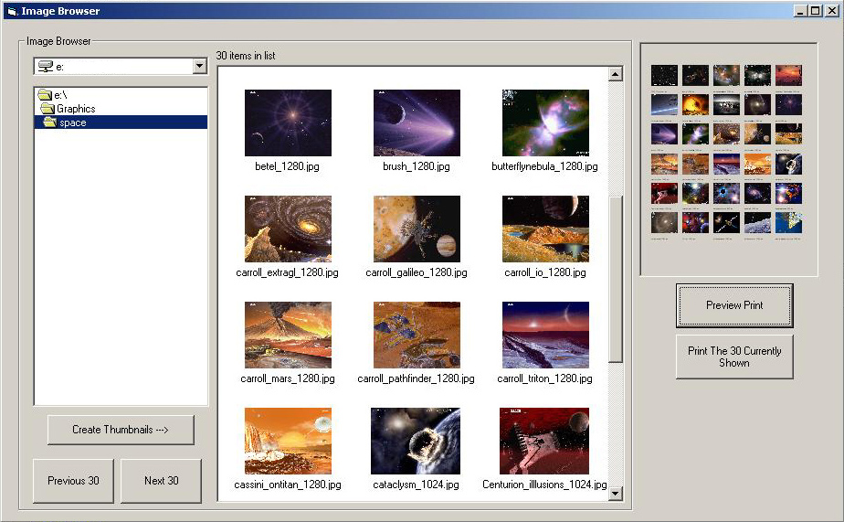 There are actually two progams included. One will create thumbnails of an entire directory, while the other one will create 30 thumbnails at a time. Both can present you with a preview of the print and then print the thumbnails. The code for browsing and creating the thumbnails came from VBC: https://www.vbcoders.com/vb/scripts/ShowCode.asp?txtCodeId=31026&lngWId=1 and the code to preview then print the images came from Microsoft: Microsoft Knowledge Base Article - 193379. I just married the two and added a loop to the Microsoft code.