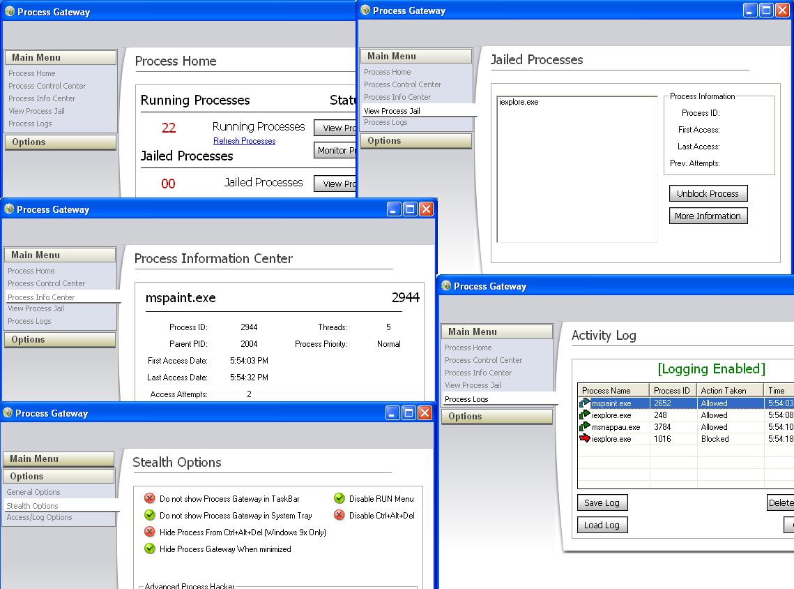 Updated version!!! Process gateway is basically a firewall for processes. It allows you to choose which processes you want to allow to run on your computer. When a new processes is detected, it prompts you to allow or block it. If no option is chosen in 10 seconds it blocks automatically, but that can be disabled. You have the option to password protect all aspects of the program and there are vaious stealth modes. These include hiding itself from taskbar systray, and making itself hidden and only accesable with a Hotkey. It also has the ability to mask itself in CTRL+ALT+DEL (Task Manager). It does this by reading Task Manager memory and editing it. It finds its name and can change it to any other process name, Such as explorer, and in turn change explorer to something else. So if you try ending the process appearing to be Process Gateway, it actually closes another process. Effectivly hiding itself.