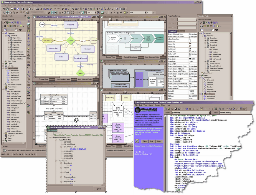 Silicon Mindset's Process Revolution 2004(PE) is a multi purpose business application essential to the optimization of any organization. The application is used to create flow charts, block diagrams, process diagrams, business diagrams, work flow diagrams and more. Diagrams can be stand alone or grouped into a Process Repository. Process Revolution 2004(PE) is perfect for new and advanced business users. This highly cost effective and feature rich application will be used over and over by all levels of users. Process Revolution diagrams can be printed, copied to memory or used to generate advanced web presentations and images (SVG, EMF, WMF, BMP, WBMP, JPG, PNG, TIFF, PCX and others). Whether creating simple organizational charts or creating advanced multi part Process Flow Diagrams users will become instantly familiar and productive. Process Revolution 2004(PE) comes with 10 Diagram/Graph/Chart layout algorithms allowing for rearranging of diagrams and Rotation of entire Diagrams. This feature is not available in any other Flow Charting / Diagramming package in Process Revolutions price range class. Process Revolution 2004(PE) uses XML and compressed XML as its native file formats allowing for OPEN sharing of Diagram information. Process Revolution 2004(PE) is the first application in a series of standalone to enterprise Process Documentation, Modeling and Management applications. Enterprise Versions of Process Revolution will be available in mid 2005 running under windows on the client side and SQL Server Database Management System (with Oracle, Microsoft Access and MySQL to follow based on user demand) on the server side. Process Revolution is a powerful, easy to learn and cost effective application. The Product comes with an extensive help file. A downloadable 145+ page PDF file is available for users wishing to print out a hard copy manual
