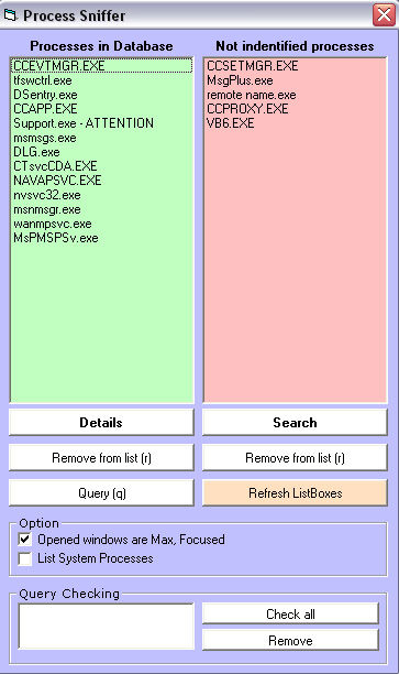This program lists all processes on computer and sorts them into listboxes depending on their detailed information. If it is available, you can also check detail info on a particular process, search for not-found processes. This application is meant to act like a Virus/Spyware/Adware protection that alerts you on common viruses etc. It automatically scans all your processes and matches them with the ones in database and those that are recorded as Spyware / Viruses etc, they are highlited with comment after the process name saying - ATTENTION