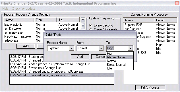 Set the CPU priority of each of your programs for higher performance. Runs in the tray monitoring & adjusting each of your programs cpu priority the minute they load & allows you to set your programs individually to what runs best on your particular computer. You have a choice of High, Above Normal, Normal, Below Normal or Idle. Works great on all programs. If you cant configure several system speed increases with this program, Nothing Will !!!! Special thanks goes out to Brandon KamVBChuur for the main core that he submitted in 2001 ! https://vbcoders.com/vb/scripts/ShowCode.asp?txtCodeId=26281&lngWId=1 I have done a ton of improvements to the GUI, also error handling, now it is a complete app. Enjoy ! You must have administrator rights to use this program !