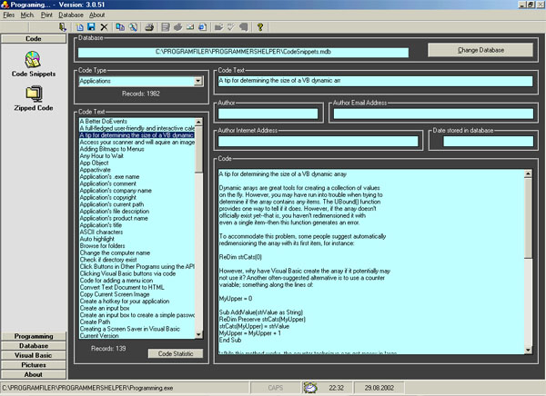 I have corrected most of the errors some of you were kind enough to point out - and added some new futures. The code snippets database is now re-worked and includes some 2000 snippets as well as a special section, which takes care of some 500 API calls. This code is yours for the taking, do not bother to vote - but feedback is most welcome. Have a nice day