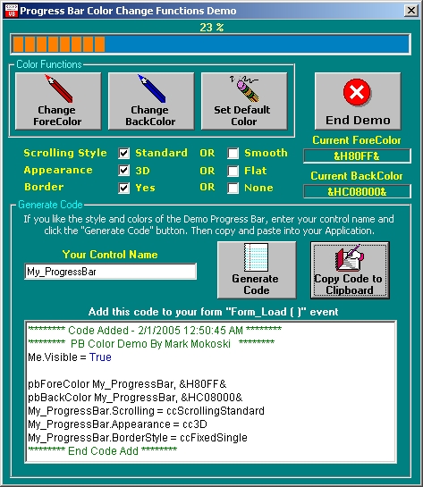 Functions module for changing colors of the plain MS Progress Bar. There a a lot of these here on VBC, this one is a bit different as the demo application also includes a Code Generator. After you get the demo Progress Bar looking the way you want, enter your control name and click the "Generate" button. Then just copy and paste into your app. All you need to do is place the Progress Bar on your form, size it and set the min/max values, and the generated code takes care of it's good looks! Hope this is usefull for others.