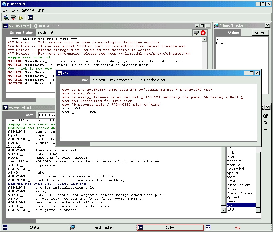 To continue with that list, I added whois, listing of channels (still not done), customization of colors, Icons to the taskbar, option of stretching the taskbar or having it a fixed width, you can join channels even if you leave out the # (ex: /join vb), that's all I can think of :)