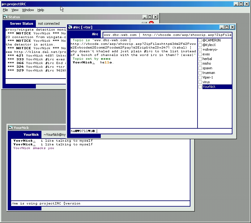 Includes support for channels and queries, up to 30 of each (can be changed for more). Supports color formatting (although it's still a little bit buggy). Supports a few aliases, /me, /quit, /msg, /query, /id, and built in variables, $server, $me, $port, $randnick, $chan, $version